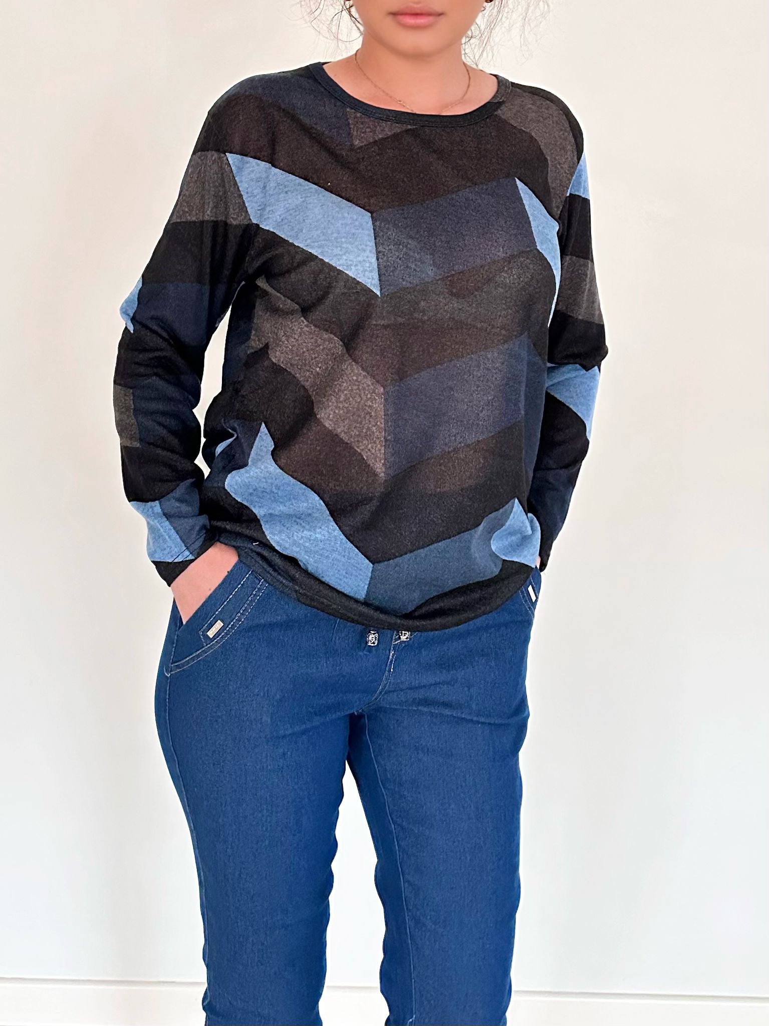 Descoperă bluza cu mânecă lungă Nomi, alegerea ideală pentru ținutele de zi cu zi sau momentele casual. Cu un imprimeu geometric modern în tonuri de albastru și negru, această bluză aduce un plus de stil fără efort oricărei garderobe. Este perfectă pentru zilele răcoroase în care vrei să te simți confortabilă, dar și să arăți impecabil.
