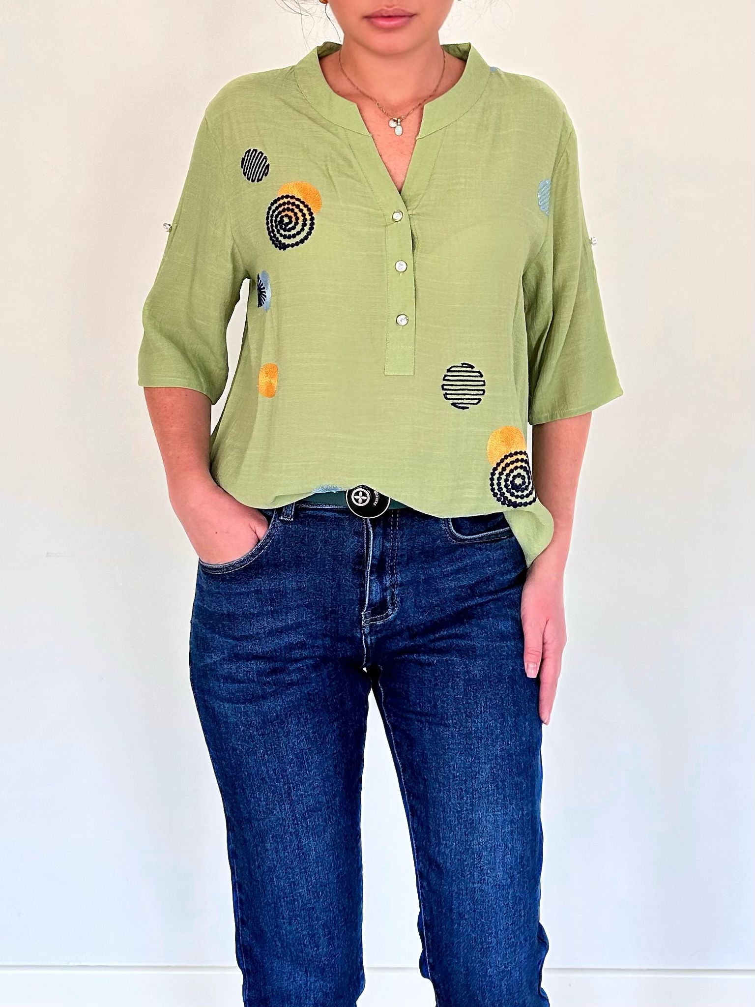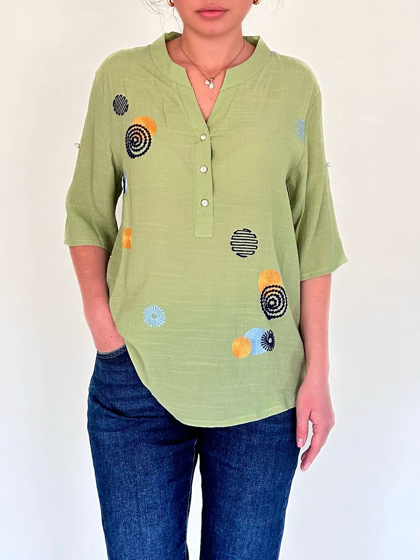 - Croială: lejeră, cu mânecă 3/4, nasturi decorativi și guler tip tunică.