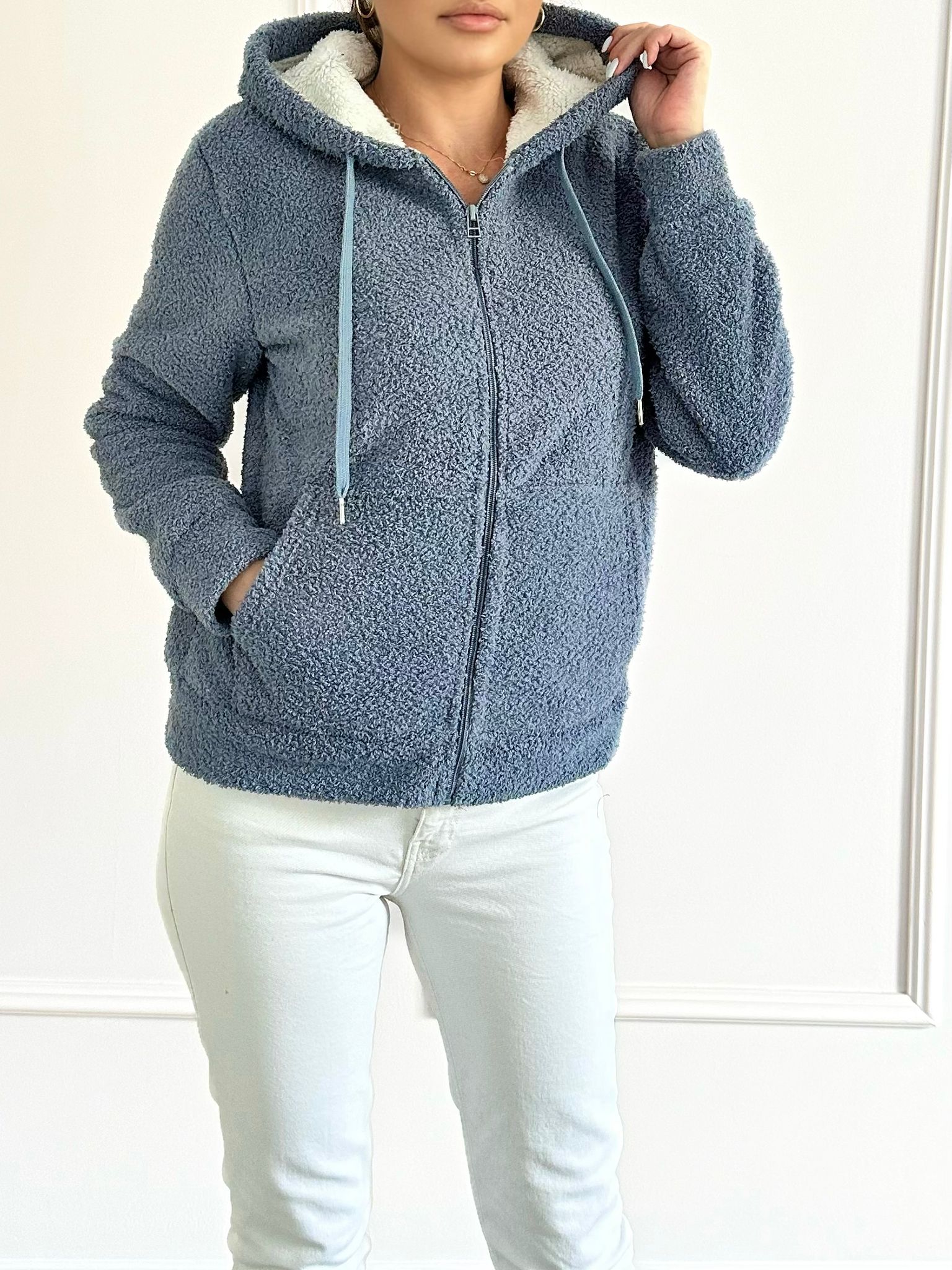 Confecționat din material teddy îmblănit, hanoracul Zaia oferă un confort sporit și o senzație deosebit de plăcută pe piele. Buzunarele laterale sunt perfecte pentru a-ți ține mâinile la cald, iar gluga ajustabilă îți oferă un plus de protecție în zilele cu vânt. Este disponibil într-o varietate de mărimi, de la S până la 3XL, potrivindu-se perfect oricărui tip de siluetă.